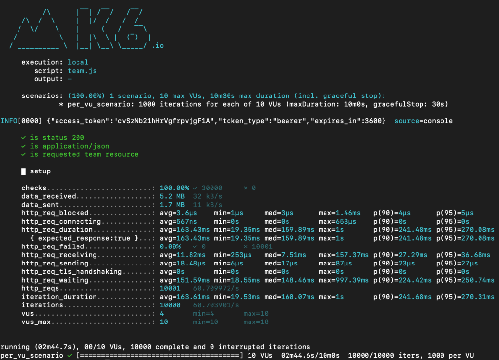 Those AutoREST services provided by ORDS for the tables and duality views are protected because that’s most likely to be the situation in production. The k6 script is hard coded with client id and client secret for authentication. When the k6 test script starts the first thing performed is to get an access / bearer token which is then subsequently used for every request generated by the script. You will notice in every script run this output indicating the token that will be sent for every request.
